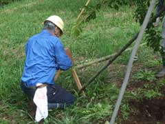桜と添え木を、水で湿らせたシュロ縄にて固縛します。